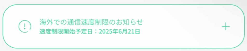ただ、海外利用10日経過後には、以下のスクリーンショットのようにahamoアプリ上で「○月○日から通信速度が制限されます」といった通知が表示されるので、こまめに確認しておくと安心です。