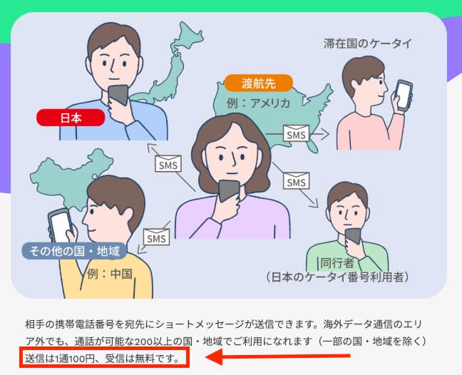 さらに、SMS(ショートメッセージ)は送信が一律100円/1通、受信は無料となっています。