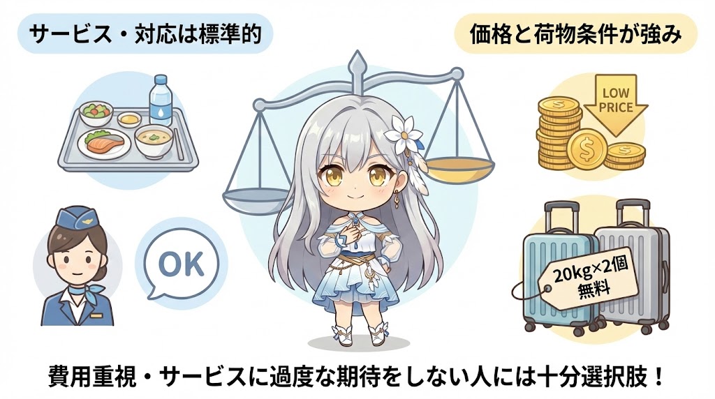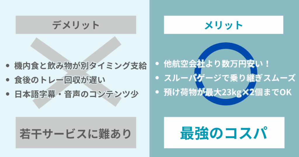 価格の安さや荷物条件の良さは大きな魅力ですが、サービス面では日本の航空会社と比べると粗さが目立つ部分もあります。