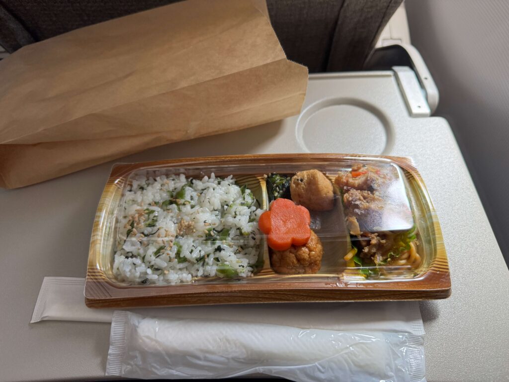 メインディッシュ、副菜、パン、デザートまで揃っており、長時間移動でも満足できるボリュームでした。