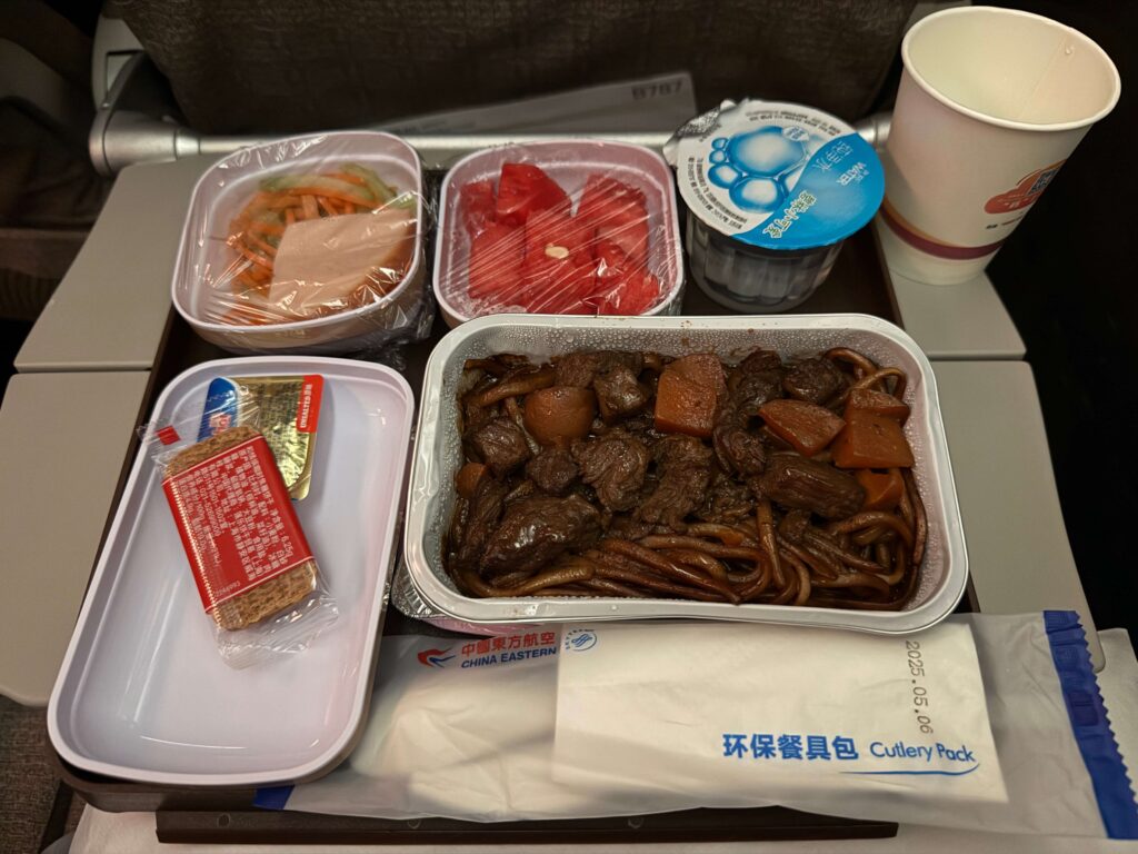 機内食が配られたときに「ドリンクも一緒に欲しい」と思う人は多いですが、中国東方航空では飲み物の提供がなぜか食後になることが多いです。