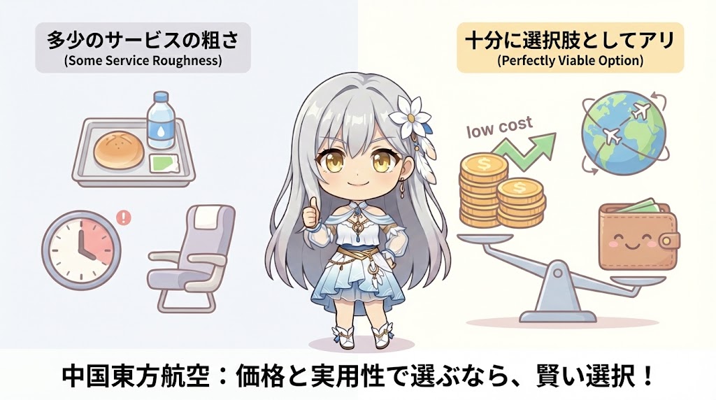 総じて言えば、細かいサービスの質や日本語対応の少なさなど、いくつかの注意点に目をつぶれるなら、中国東方航空は十分に利用価値のある航空会社です。