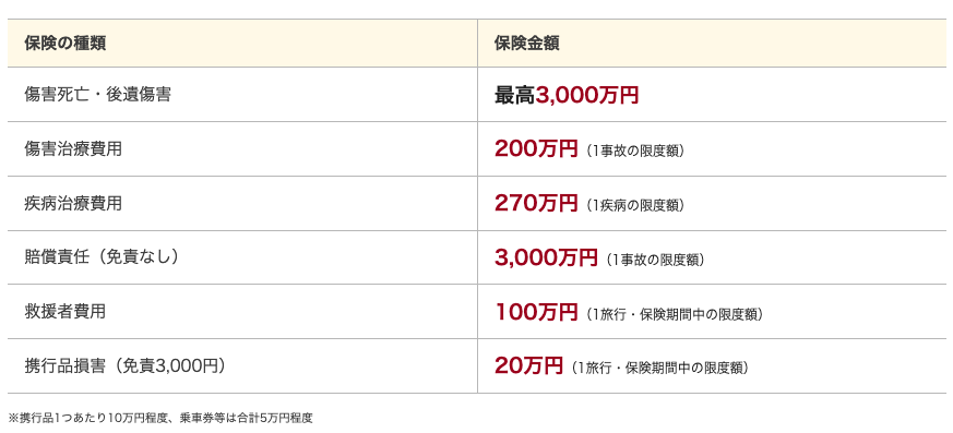 以下の年会費無料とは思えない手厚い補償が付いています。