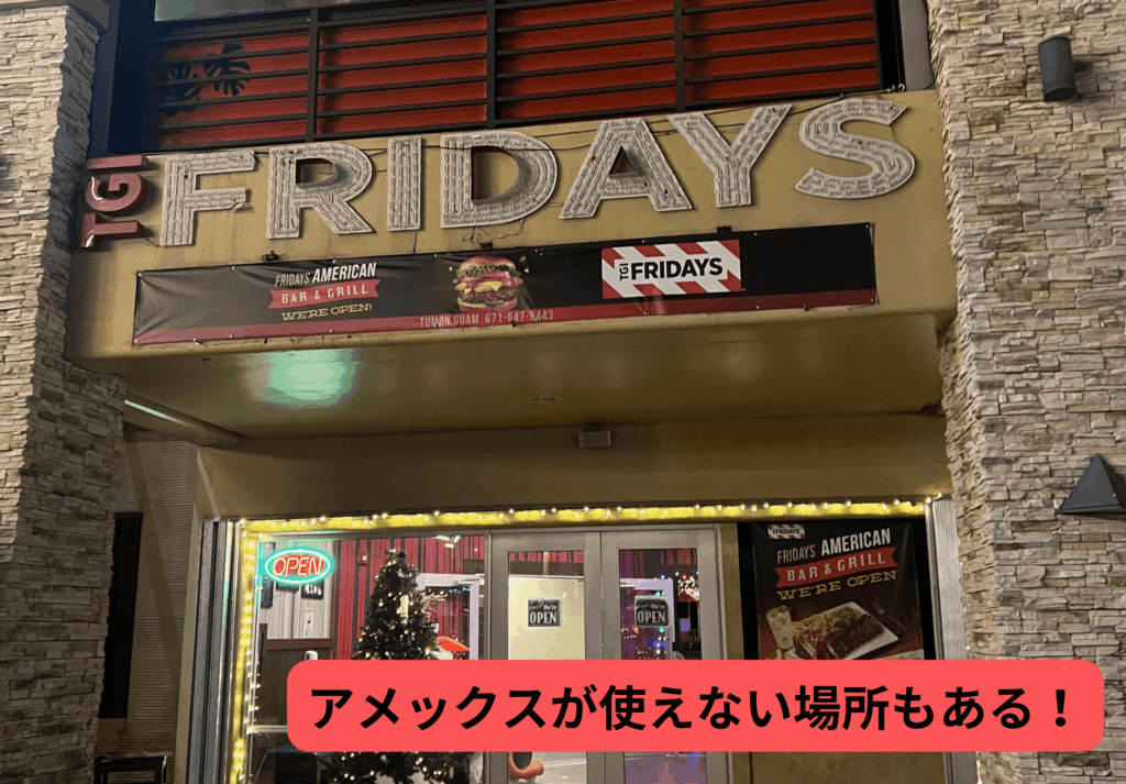 実際、私もJPスーパーストア横の人気レストラン「TGI FRIDAY’S」でAMEXが使えなかったので、JCBカードにて決済しました。