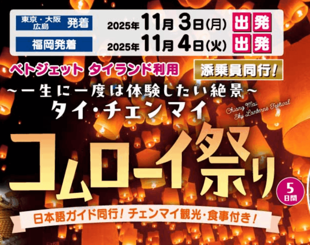 福岡発着のコムローイ祭りのツアーは以下のものがありました。