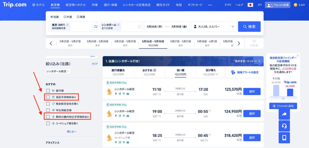 トリップドットコムでは、絞り込み機能に「手荷物あり/なし」のチェックが付けれる仕様になっており、初心者でも間違えにくいのが魅力です!