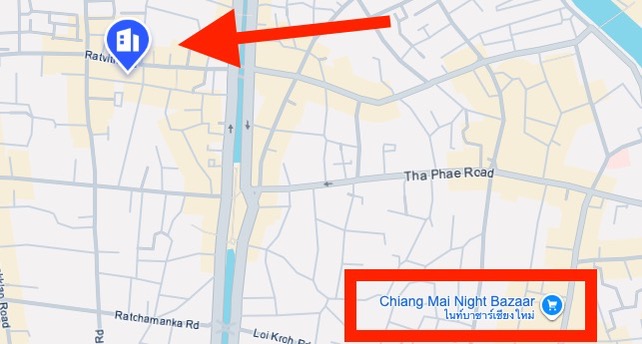 今回、福岡発→バンコク経由→チェンマイ到着が夕方だったため、夕方着でも楽しめるホテルの立地を重視しました。