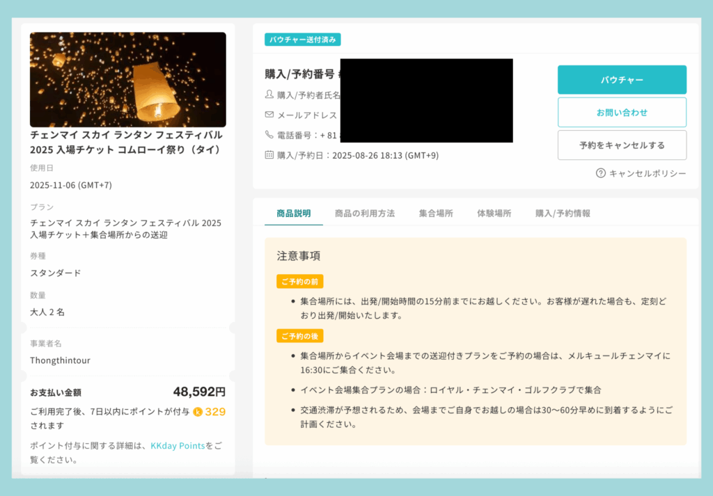 コムローイ祭りの「ロイヤル会場」ツアーは、KKdayが最安だったためこちらで予約しました。
