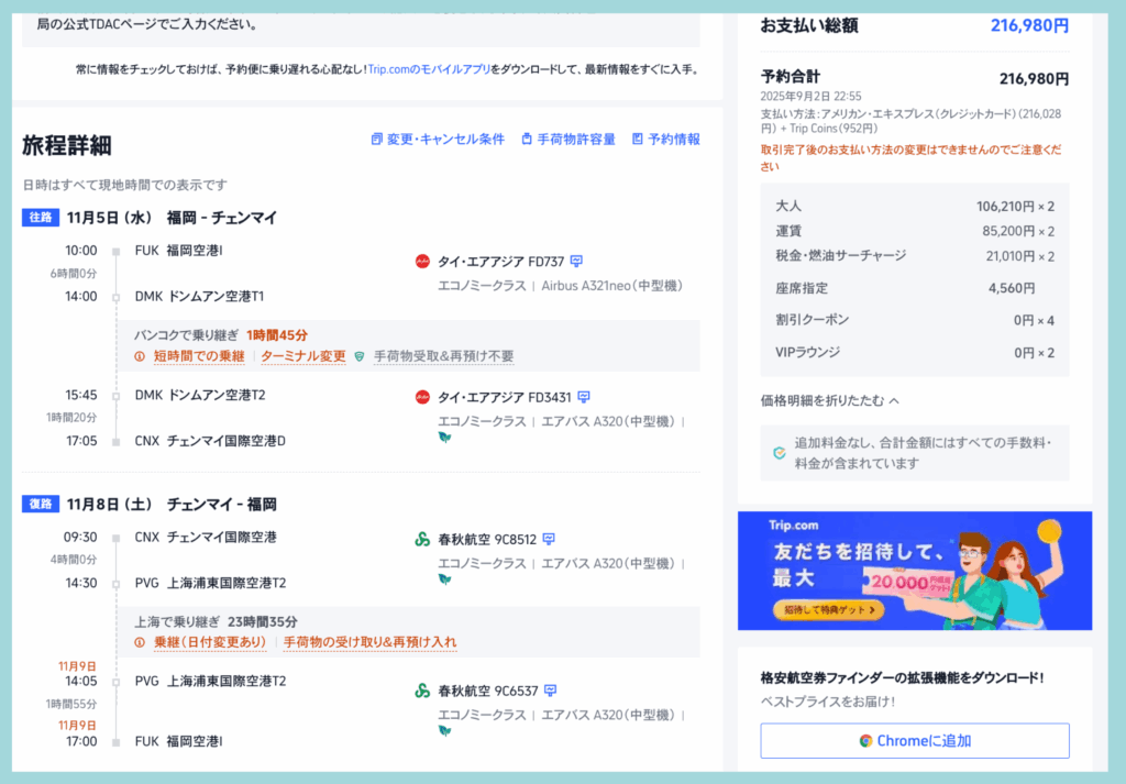 結果的にツアーの約半額(2人で34万円)でチェンマイ旅行を手配できました。