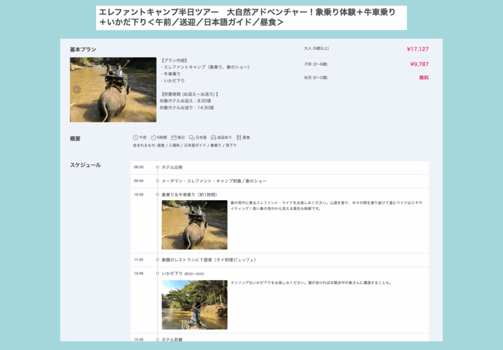 実際に象に乗ることができるプランかつ、他に余分なオプションが付いていなかったため、こちらで予約。
