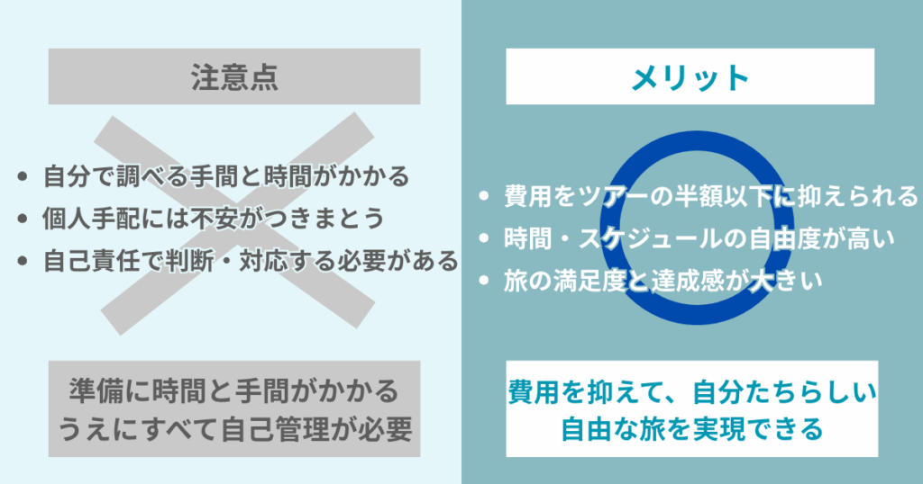 - 個人手配は調べる手間があるが、それ自体が旅を楽しむプロセスになる