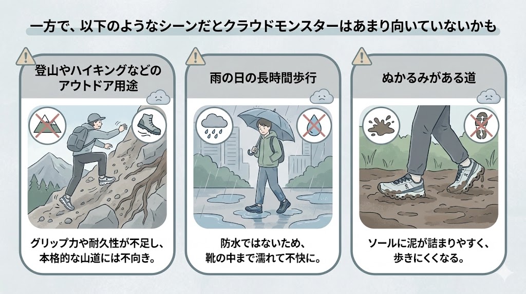 というのも、クラウドモンスターは防水仕様(GORE-TEX)や滑りにくいVibramソールを採用していないため、防滑性や防水性が高くないという弱点もあります。