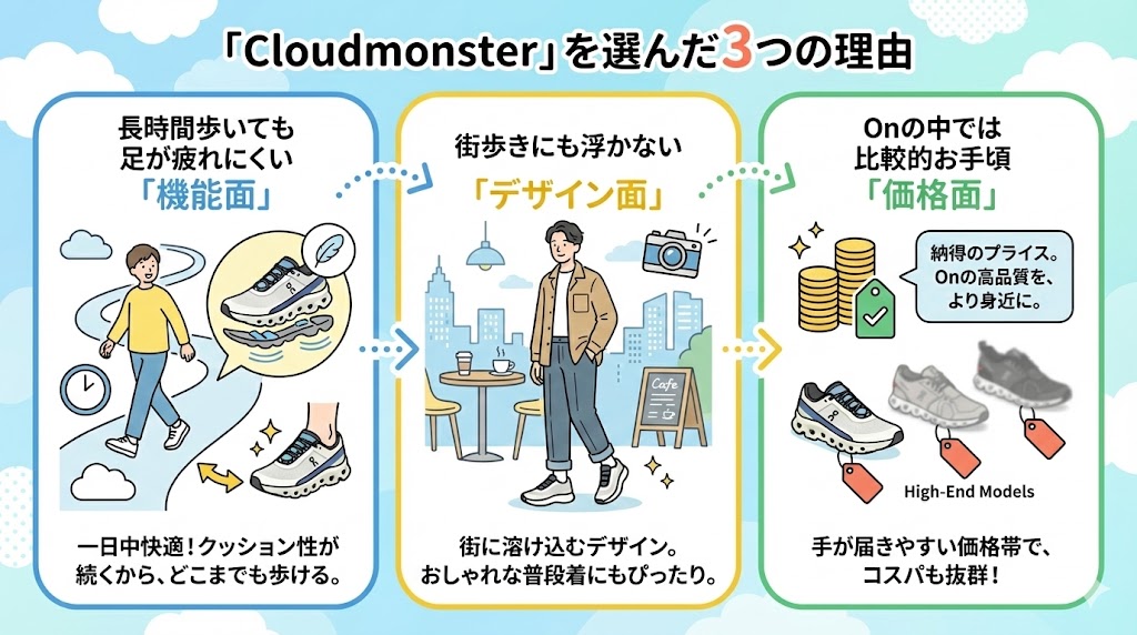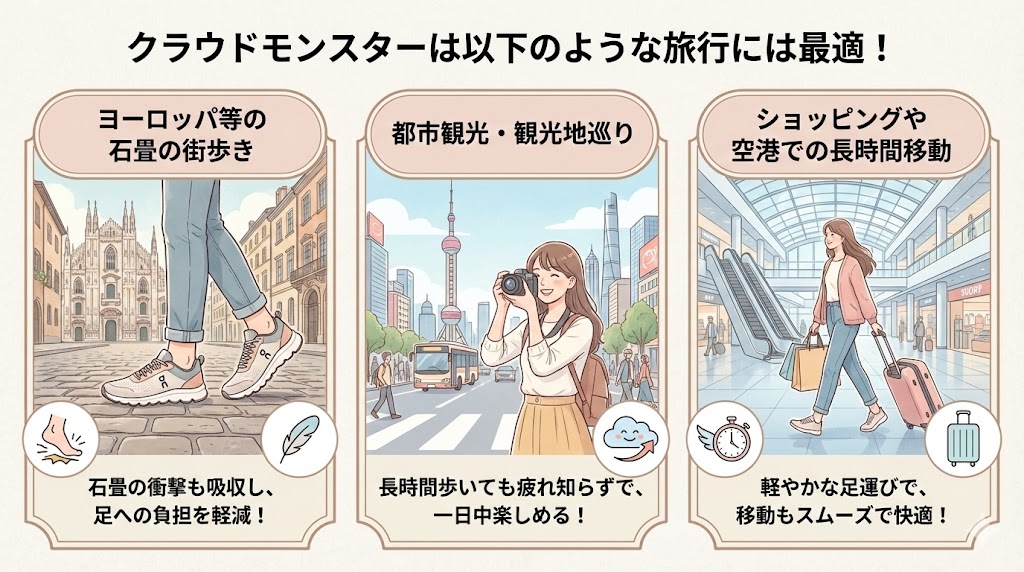 クラウドモンスターは、ただのスニーカーではなく、旅の質を高めてくれるパートナーのような存在です。