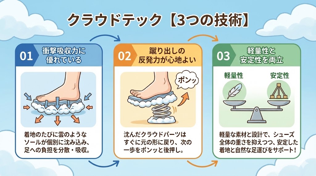 On独自の雲のように丸く連なったソール構造で、ただの見た目のインパクトにとどまらず、実際に履き心地を左右する以下の「3つの技術」が詰まっています。