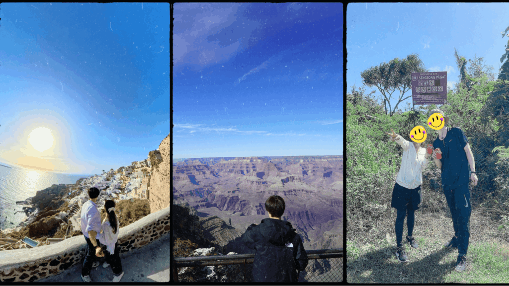 これまで訪れてきたのは、サントリーニ島の白い街並み、アメリカの絶景、グアムの大自然など、世界の絶景を巡る旅が中心。